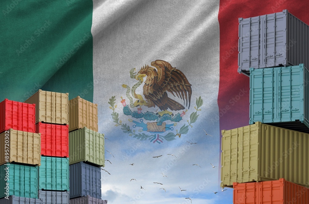 Mexico flag and big stack of shipping cargo containers in docks with sky background close up