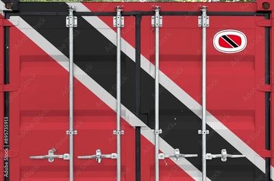 Trinidad and Tobago flag depicted on metal doors of shipping cargo container outdoors in docks area close up