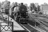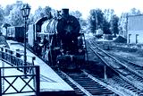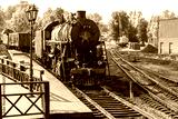 Retro passenger train with black steam locomotive from USSR times