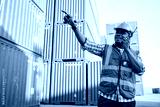 African factory worker or engineer using walkie talkie and talking about work in containers warehouse storage