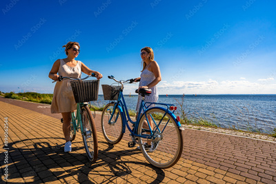Chance meeting of friends. Two young women in summer dresses with city bikes standing and talking on bicycle path by sea on beautiful sunny day.