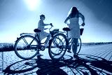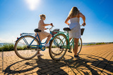 Physical activity in summer. Two young women in dresses getting on city bikes on bicycle path by sea on beautiful sunny day.