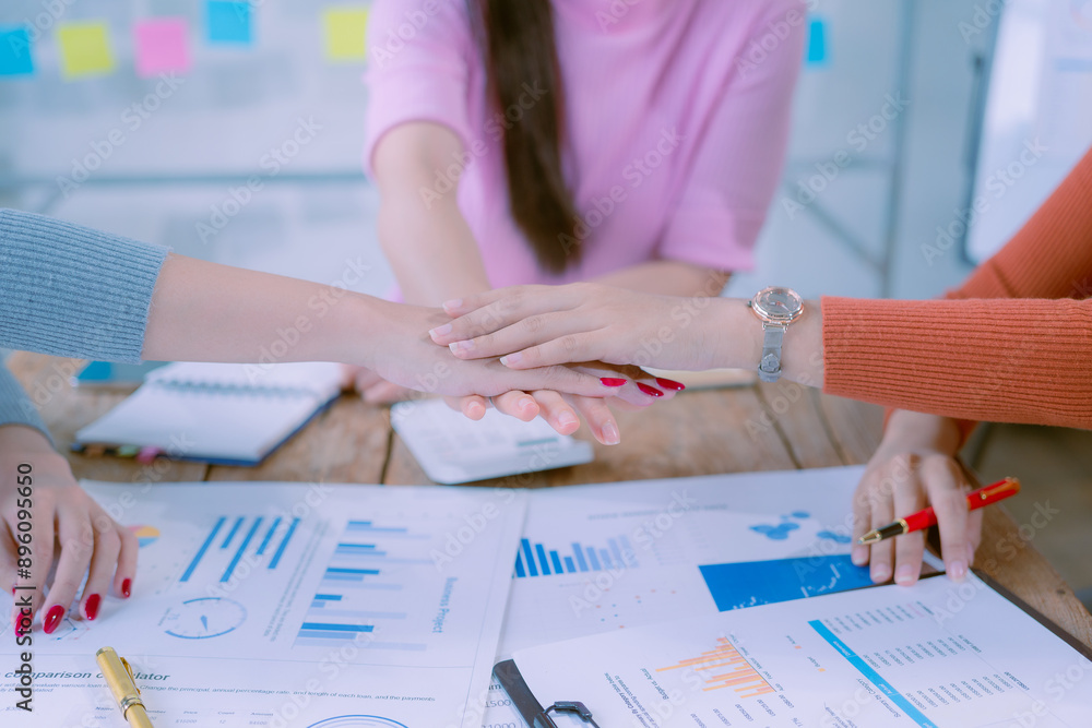Collaboration agreement of entrepreneurs holding hands with financial paper graphs on the table Businessmen shake hands to confirm a business agreement, joint investment and agree on a work contract.