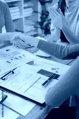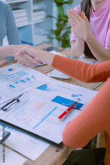 Collaboration agreement of entrepreneurs holding hands with financial paper graphs on the table Businessmen shake hands to confirm a business agreement, joint investment and agree on a work contract.