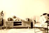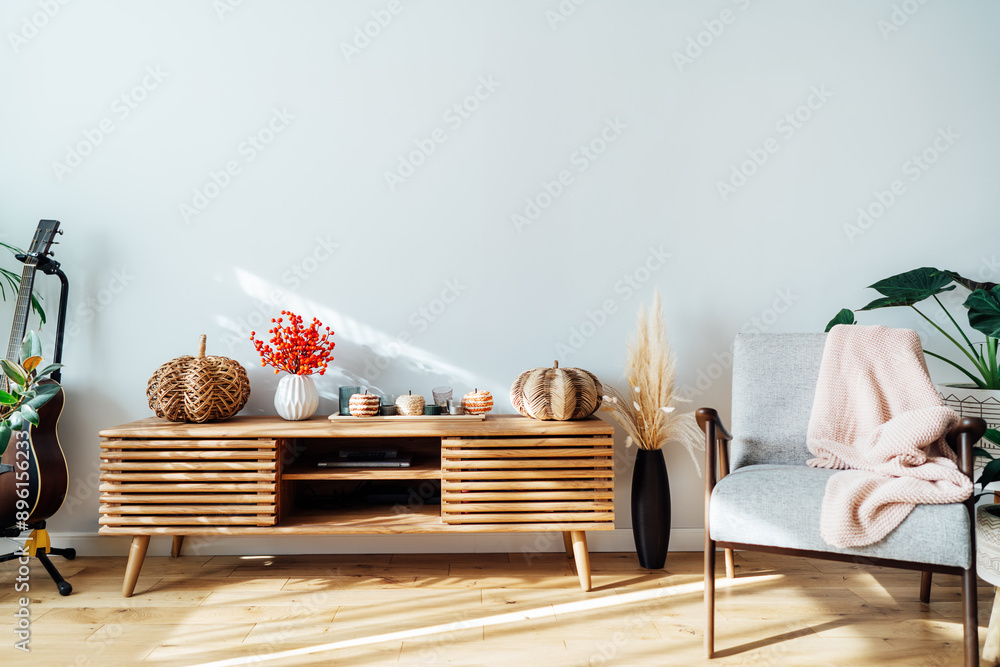 Stylish modern Scandinavian interior of living room with seasonal autumn decor on the wooden console and modern armchair with knitted plaid in sunset light. Cozy home interior design with a fall mood