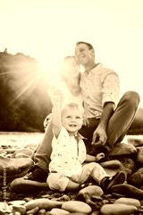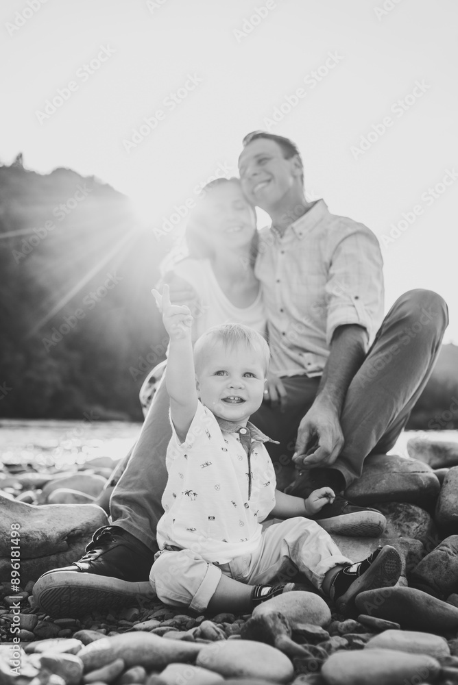 Happy family holiday in summer. Mother, father and baby son sitting on beach near lake. Fathers, mother, Children day. Spending time together. Mom, dad play with child at sunset. Black and white photo