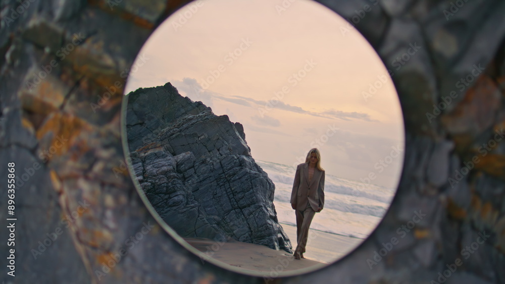 Woman stepping sunset beach in mirror reflection. Amazing evening sky at ocean