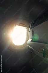 Airplane window. View from inside the cabin.