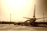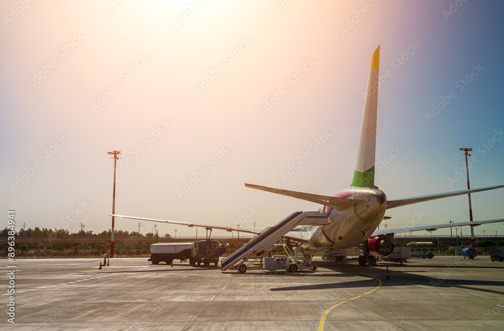 Passenger plane in the airport at sunrise. Aircraft maintenance.