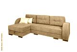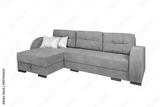 Gray corner sofa with velor fabric pillows isolated on a white background. Cushioned furniture.