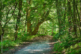 a forest road in summer among lush vegetation and trees, with a mighty old plane tree in the background