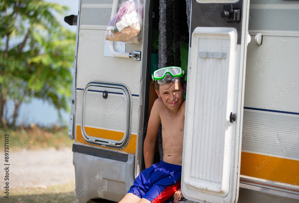 A boy is sitting in the back of a camper wearing a snorkel mask. He is smiling and he is enjoying himself