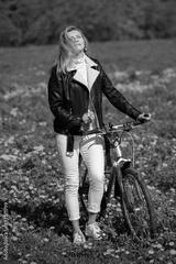 An adult woman rides a bicycle through a spring meadow and enjoys the moment.