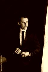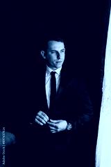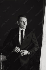 A man in a suit is standing in front of a window, adjusting his tie. Concept of formality and professionalism, as the man is dressed in a suit and tie