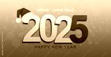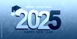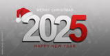 3d Happy New Year 2025 white and red Numbers. Symbols cartoon render with red hat santa. Christmas decoration. Celebrate party Xmas Poster banner, cover card, brochure, flyer, layout design.