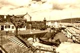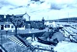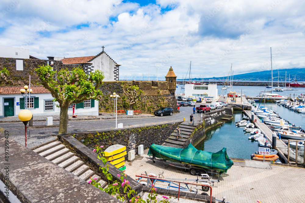 Sailing boats and fishing ships anchoring in Horta port with typical Portuguese architecture, Azores, Portugal