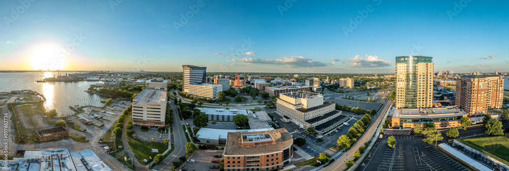 Aerial view of historic downtown district of Norfolk Virginia before sunset