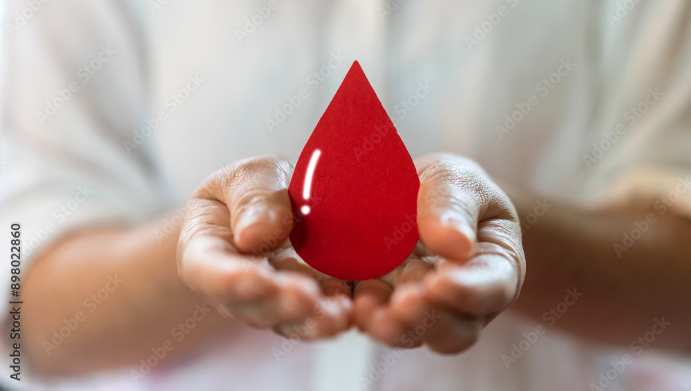 Hand hold red heart and blood drop donation, save life, world hemophilia day, world blood donor day, medical awareness, compassion and charity, hospital, life health insurance, world mental health day