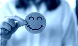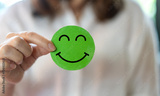 Hand holding paper cut circle symbol face smile, happy, relax, satisfaction survey, customer services, positive, good, wellness, health child, hospital, world mental health day concept.