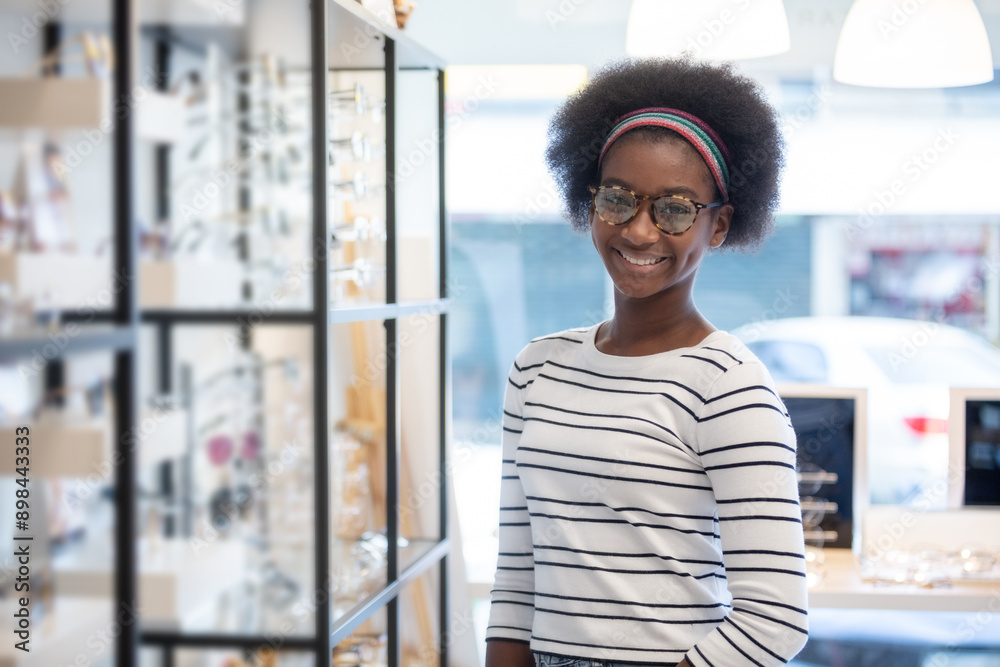 Portrait happy young woman African American afro hair smile wear spectacles standing at optical shop. modern ophthalmologist concept.