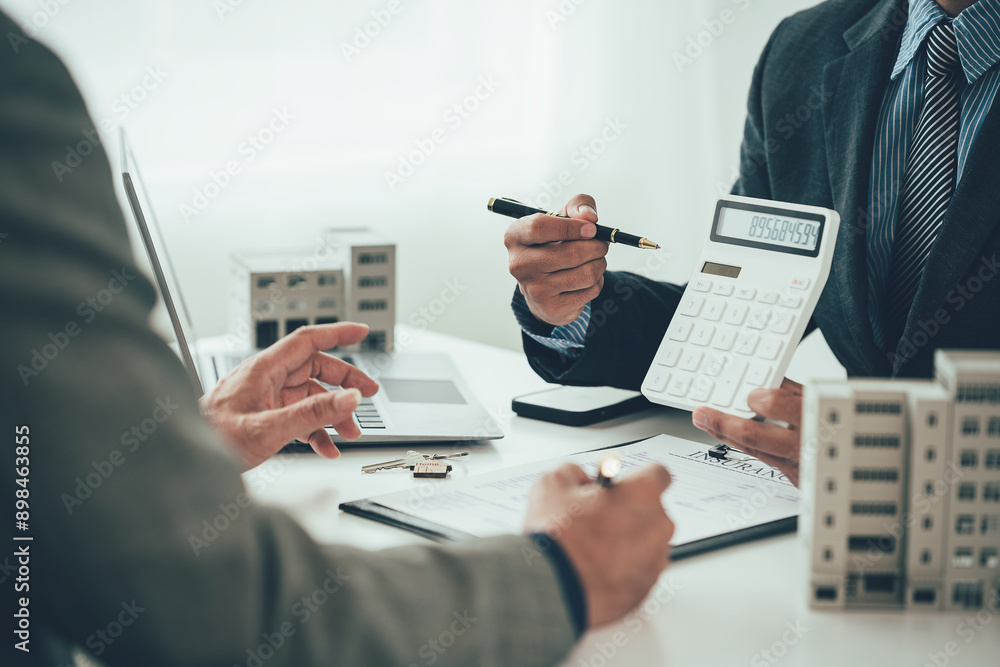 real estate agent Condo salesperson talks to customers Offer promotions for selling houses with contract signing Close-up pictures of ideas for selling houses and condos