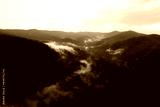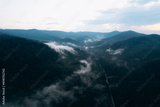 Mountains with pine forest in the fog. Foggy landscape with fir forest.