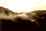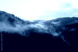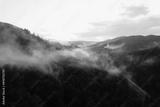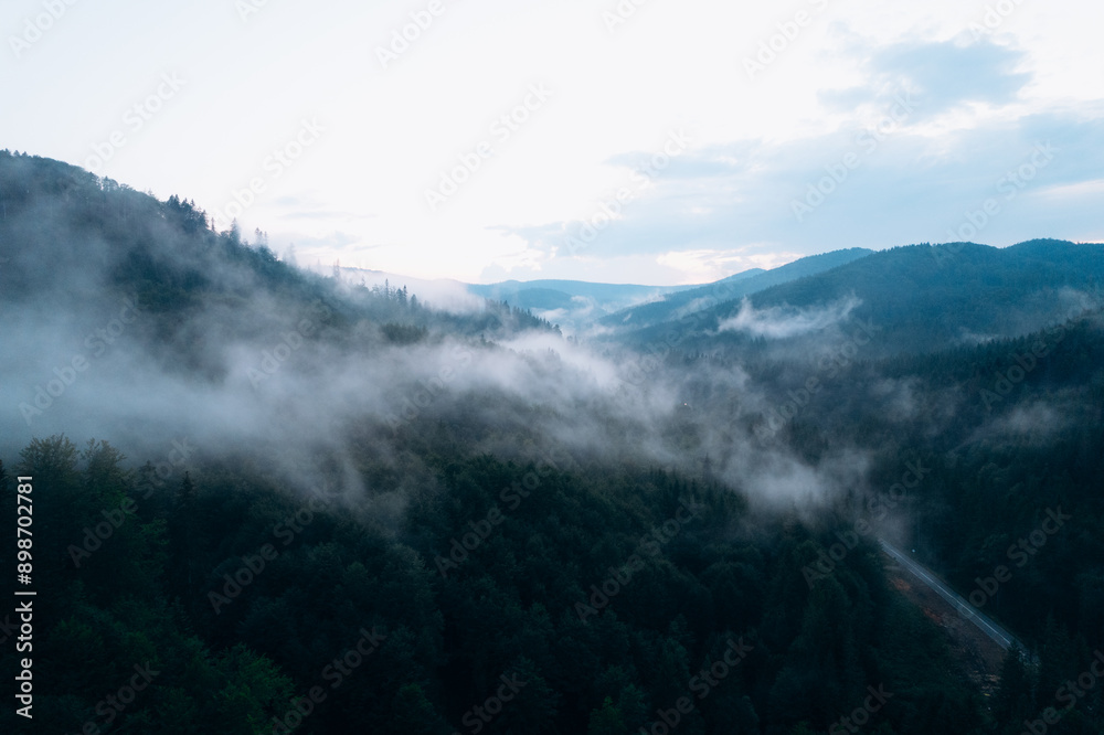 Mountains with pine forest in the fog. Foggy landscape with fir forest.