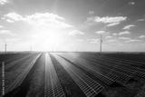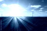 Solar panels park and wind turbines at sunny day.Windmill turbines generating green energy electric.Green energy reduce carbon emissions and makes earth cleaner and more ecological.