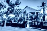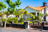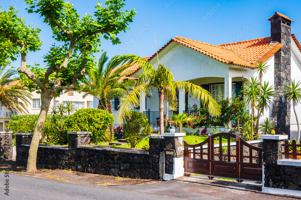Typical house with garden built in traditional colonial style in Madalena village, Pico island, Azores, Portugal