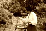 Female artis paints a picture in the park. Mindfulness, art therapy, creativity concept. Process of plein air painting in nature. A series of photos showing the step-by-step creation of a painting
