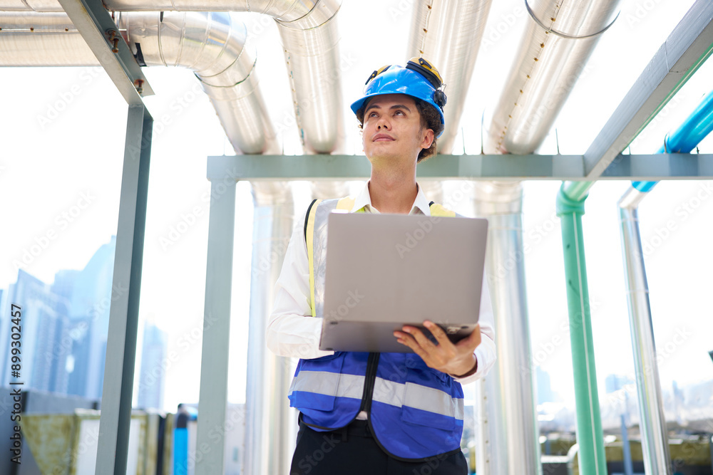 Engineer or technician working on laptop computer and checking air conditioner control valve at plumbing systems