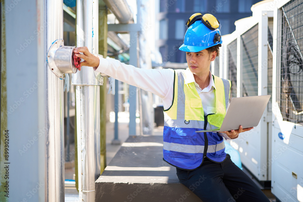 Engineer or technician working on laptop computer and checking air conditioner control valve at plumbing systems
