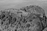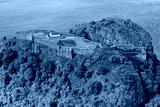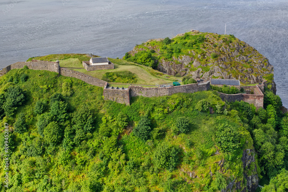 Dumbarton castle building on volcanic rock aerial view from above Scotland