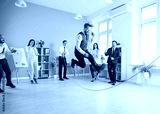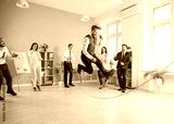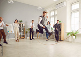 Group of happy funny young business people company employees having fun jump in jumping rope during a meeting in modern office. Teamwork, corporate team building and success concept.