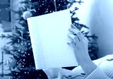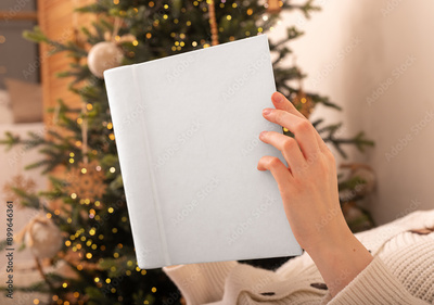 Hands holding book cover mockup on Christmas holiday, reading literature at cozy home