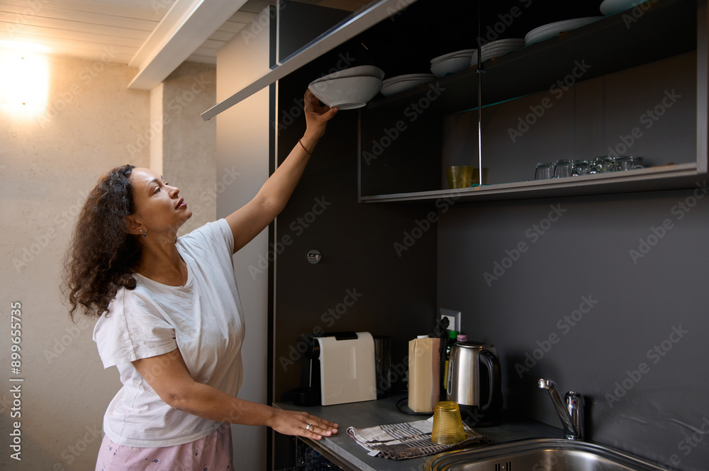 Woman reaching for bowl in modern kitchen, domestic scene with cozy and organized setting