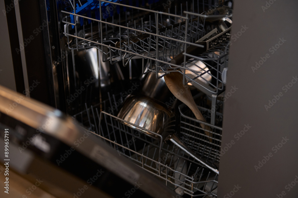Open dishwasher loaded with kitchen utensils, pots, and wooden spoon