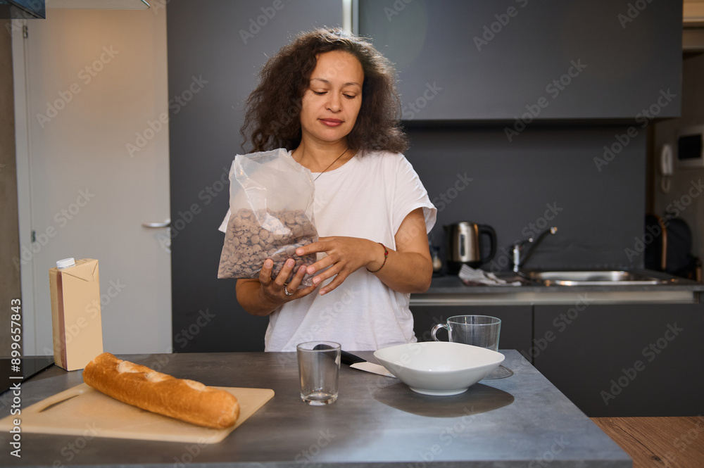 Woman preparing breakfast in modern kitchen with bread, cereal, and milk