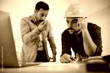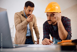 Worried construction worker analyzing blueprints on laptop while frustrated home owner is yelling at him.