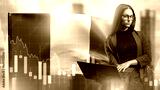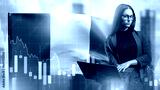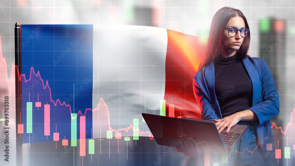 Business woman from France. Girl investor with laptop. France flag. Trading on french stock exchange. Lady business owner. Trading charts near female investor. Woman building business in France