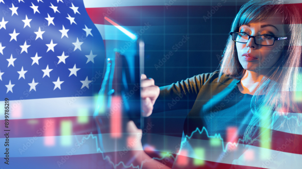 Woman trader from USA. Businesswoman works with electronic tablet. Girl trader near US flag. Lady trades on American stock exchange. Business woman buys and sells American stocks. Trader near charts