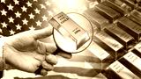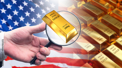 USA gold reserves. American flag. Gold bar under magnifying glass. Hand investment analyst. United States gold reserves. Warehouse golden bars with USA flag. Investing in precious metals in America.