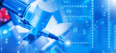 Microelectronics production. Equipment for production of microboards. Robotic soldering machine. Microelectronics production. High-tech industrial robot. Microelectronics industry.