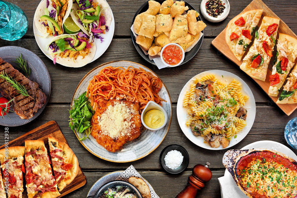 Table scene of various delicious foods. Top down view on a dark wood background. Pastas, flatbreads, tacos, steak and restaurant theme dishes.