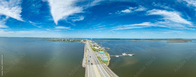 Aerial view of Pond Island Outer Banks NC OBX, coastal highway connecting the outer islands to the mainland with marina, luxury vacation homes