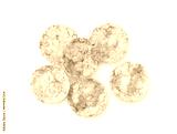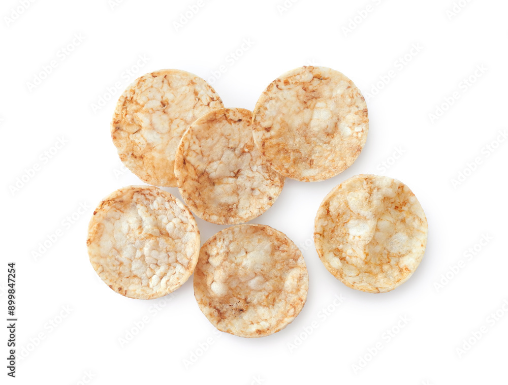 Round brown rice chips, salty crispy snack isolated on white background top view
