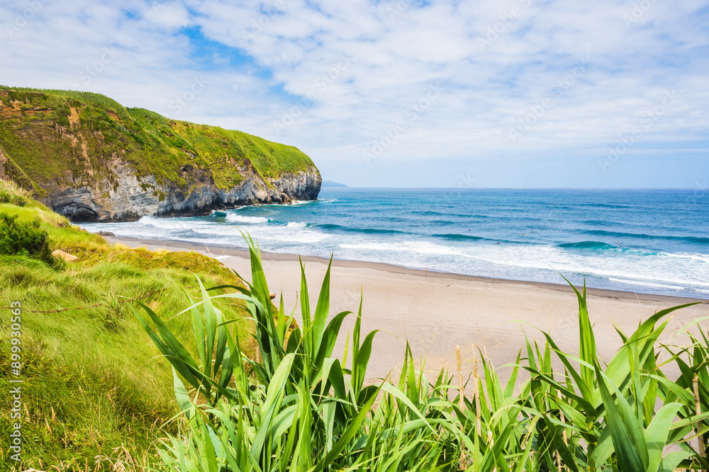 View of stunning Saota Barbara bay and beach with black sand and cliffs in ocean, Sao Miguel island, Azores, Portugal