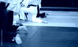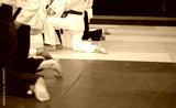 People in kimono and hakama sitting on tatami on martial arts training seminar
