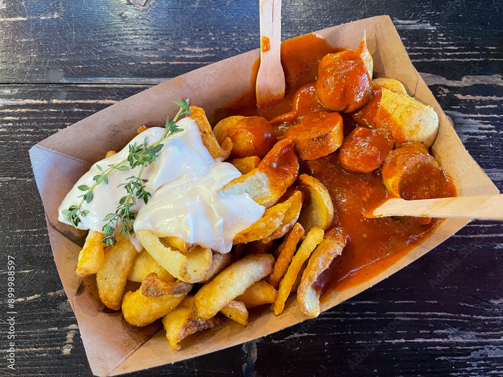 Traditional German curry wurst street food dish with tomato sauce, curry powder and french fries with mayonnaise on a paper plate directly above view