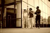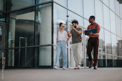 Business professionals walking and discussing outside a modern city office building, collaborating on work and ideas.